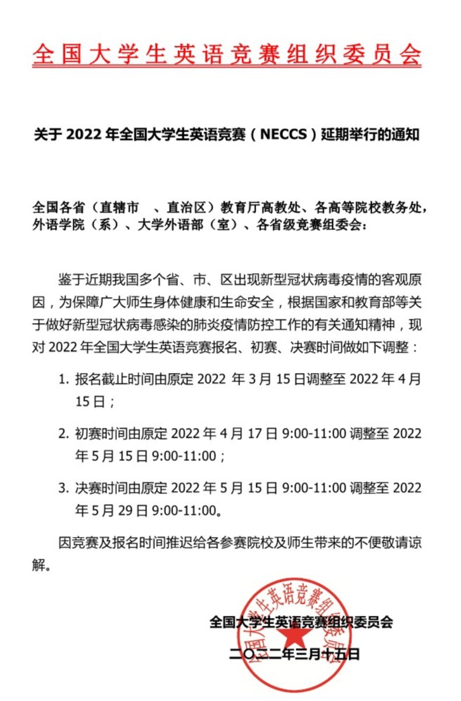 接全国大学生英语竞赛组织委员会通知,鉴于近期我国多个省、市、区出现新型冠状病毒疫情的客观原因,为保障广大师生身体健康和生命安全,根据国家和教育部等关于做好新型冠状病毒感染的肺炎疫情防控工作的有关通知精神,2022年全国大学生英语竞赛初赛、决赛时间做出如下调整: